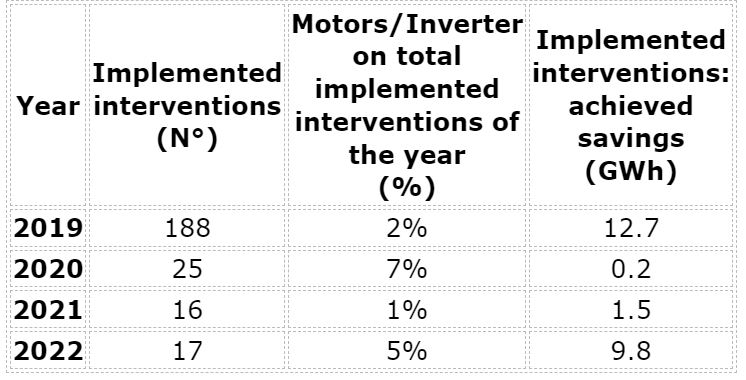 The following data, related to the both the industrial and service sectors, shows the impact of motor-related interventions in the period 2019-2022 (source: ENEA, responsible authority for monitoring):